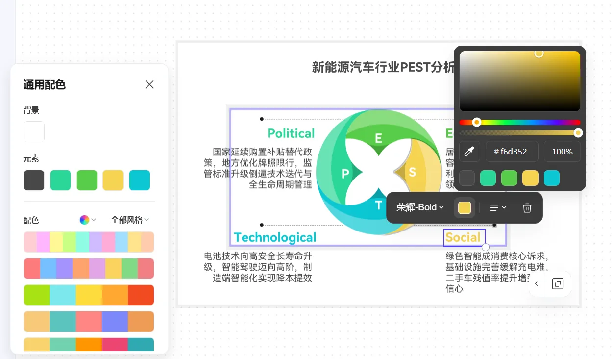 内置多场景模板,且支持深度风格自定义,兼顾 “快速出图” 与 “个性化表达” 需求。同时提供精细化调整功能,支持自定义配色方案(适配品牌颜色或个人偏好)、字体样式(涵盖思源黑体、荣耀系列等多类字体)、图标元素(可更换图标样式并调整颜色)。