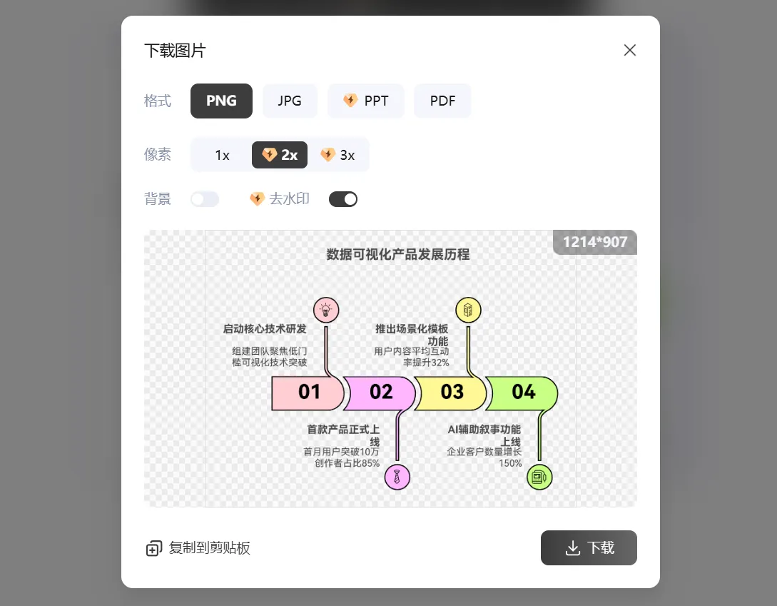 PicDoc支持多格式无水印输出,且适配不同使用场景需求。用户生成图表后,可直接导出为图片(PNG、JPG)、演示文稿(PPT)、便携式文档(PDF)等常用格式,无需借助第三方工具转换;导出时可自由选择像素精度(1x/2x/3x)与背景显示状态,满足 “插入报告无背景干扰”“打印张贴高清显示” 等不同需求。