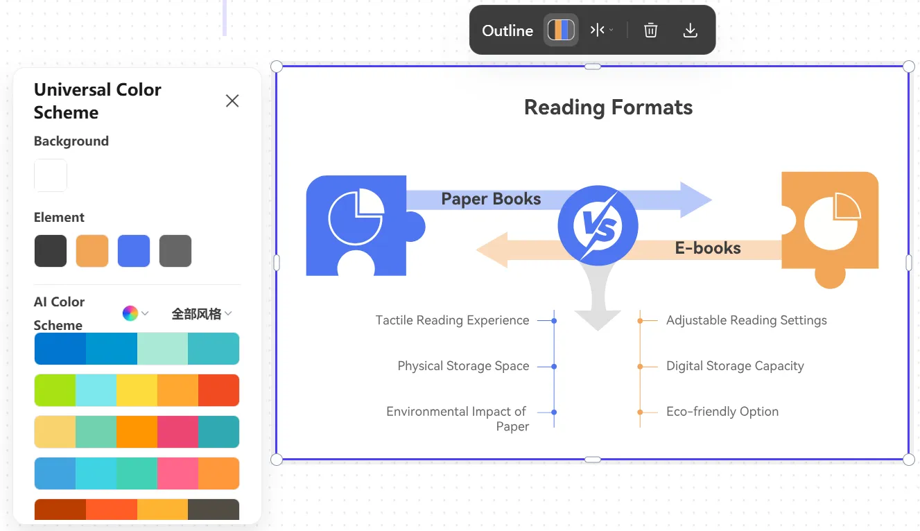 - 图表模板丰富:可生成对比图、流程图、维恩图等多种图表,用户可根据需求选择喜好的类型和风格。