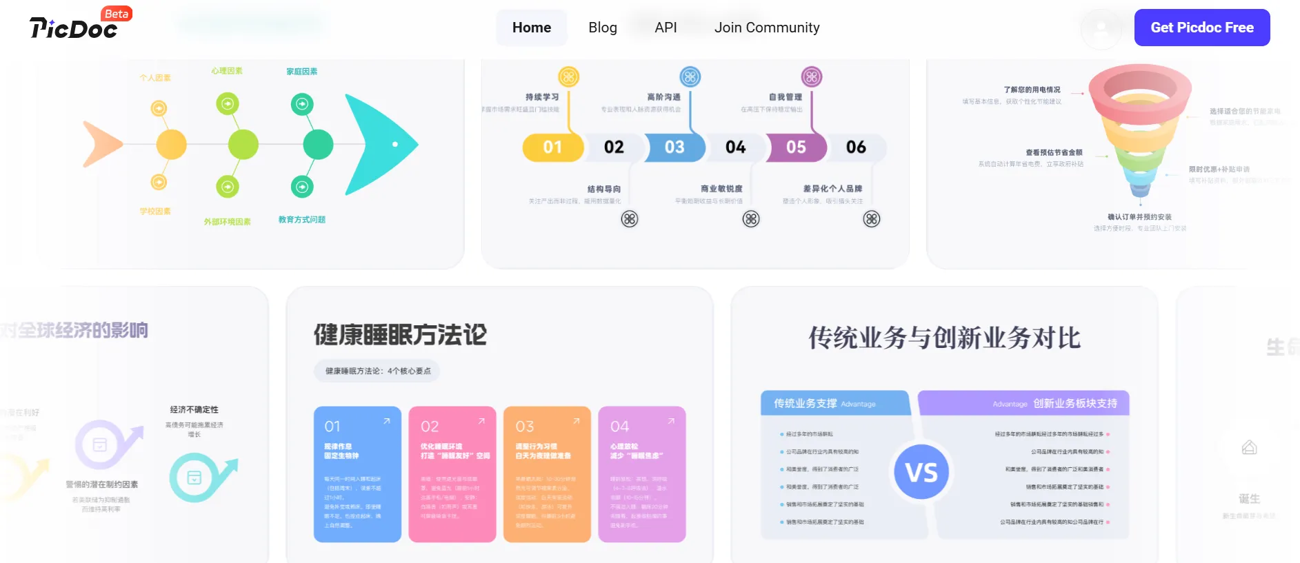 对比图是整理信息、清晰传达的强大可视化工具。然而,从零开始制作耗时较长,且布局与设计常令人头疼,要轻松制作出美观的对比图并非易事。为此,自动生成文本可视化图表的AI工具PicDoc应运而生。只需输入内容,即可快速生成美观的对比图,因此特别推荐给需要高效工作的商务人士、学生以及创作者。