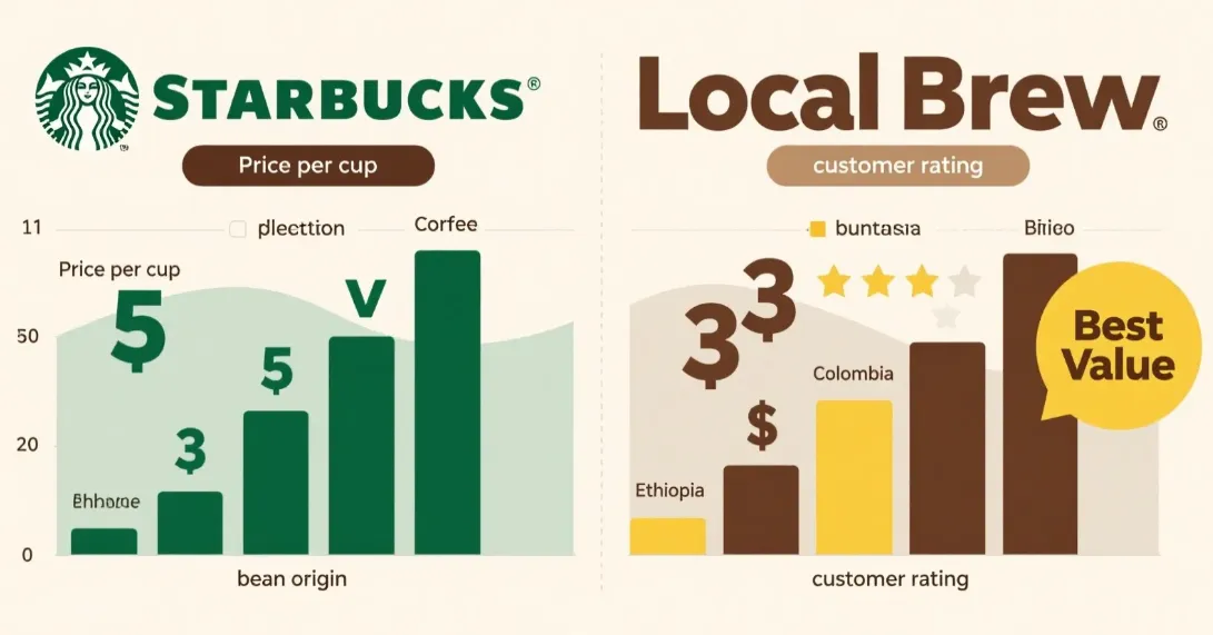 示例:两个咖啡品牌“Starbucks”和“Local Brew”的对比图表包括: