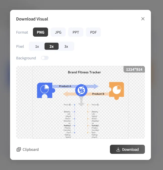 自动生成图表,优化样式:只需几秒钟,AI将适配基础对比图模板,并自动调整图表大小、元素比例和颜色,确保图表既清晰又美观。