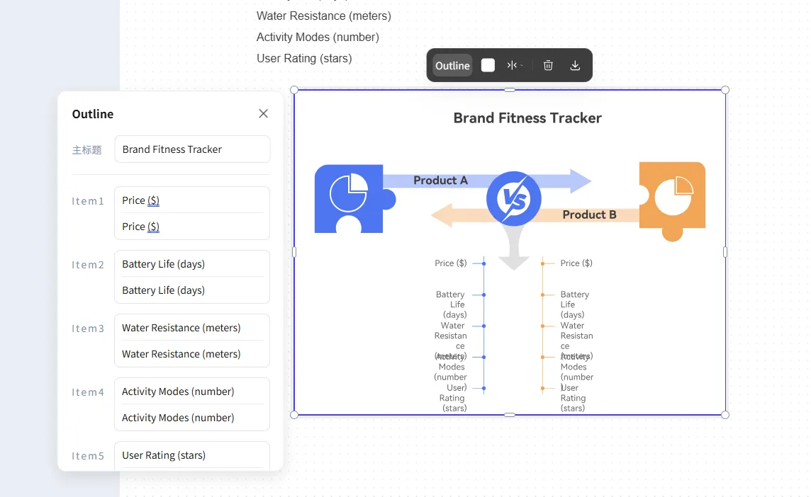即使您没有设计经验,只要能清晰定义各个对象及其差异关系(它们将在大纲中显示,支持编辑),即可使用PicDoc创建专业对比图。