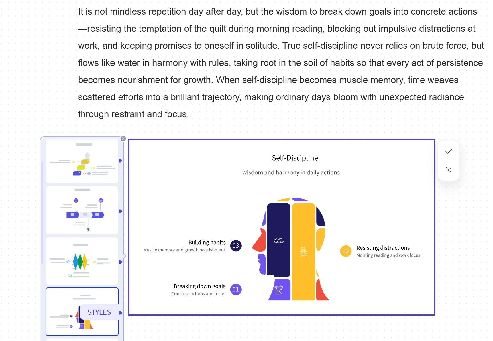 等待几秒钟,AI将根据选定的文本自动生成匹配的可视化图表。您可通过左侧列表选择合适的风格和样式,确认后点击右侧的“√”即可插入到文档中。