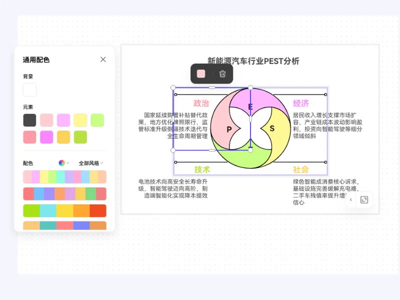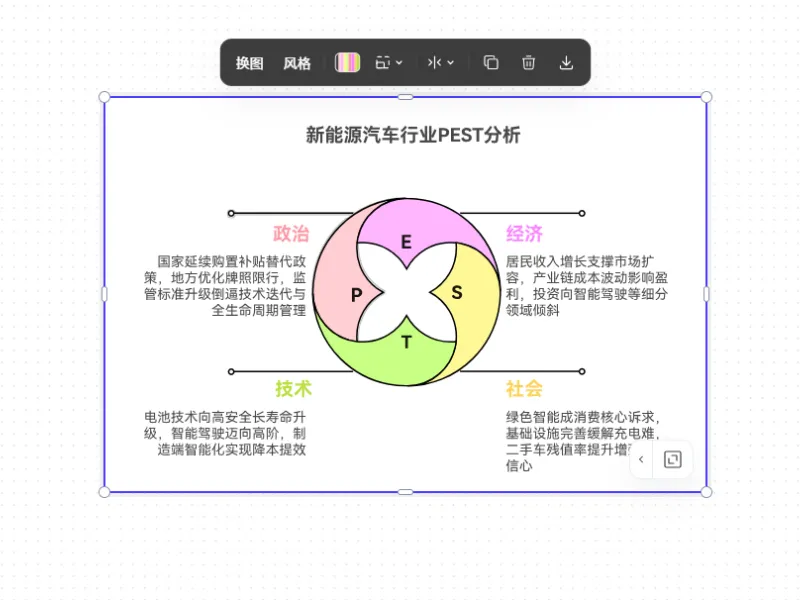 无需手动绘制,输入关键词或上传资料,PicDoc 能自动梳理政治、经济、社会、技术四个维度的核心信息,生成结构清晰、风格专业的 PEST 分析图。支持自定义配色、修改数据标签,让分析成果既能看得懂又能颜值高。