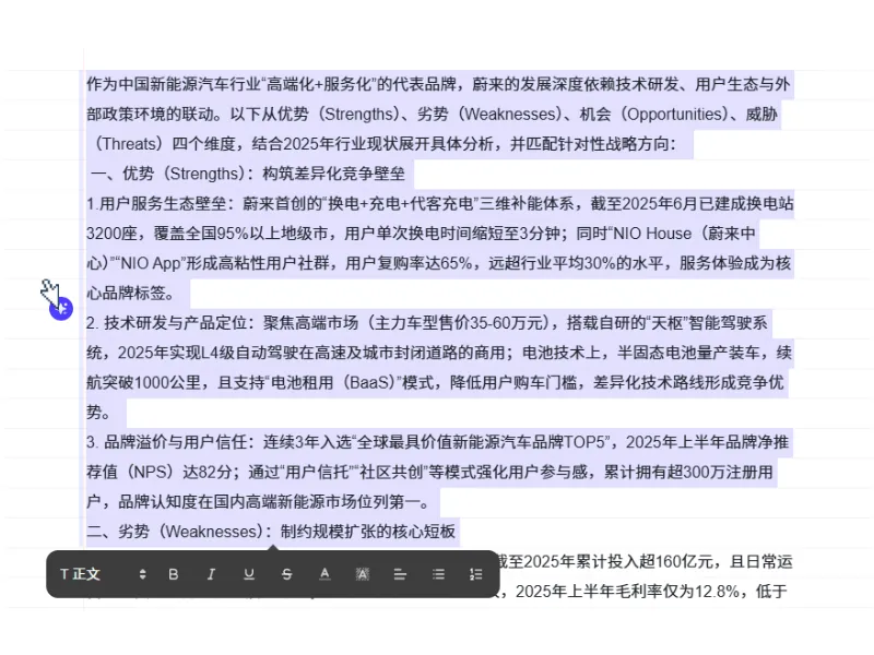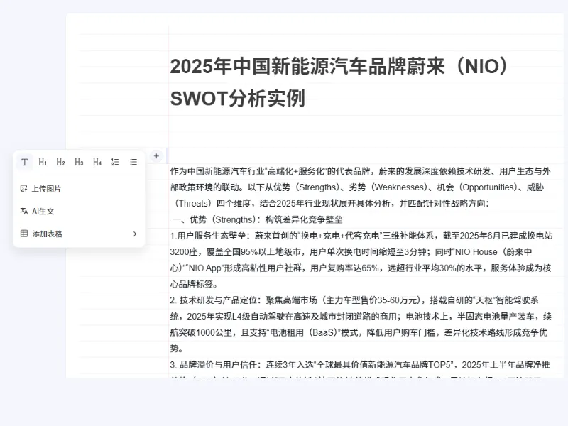 例如,输入"对某产品的SWOT分析"这一主题后,PicDoc会自动撰写并整理文本。